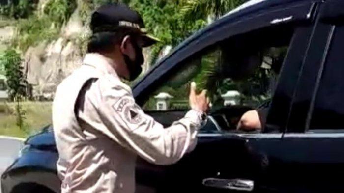 SERAMBINEWS.COM - Seorang anggota dewan enggan mengenakan masker saat melewati posko check point perbatasan Agam dengan Pasaman di Salareh Aia, Jambatan Masang, Selasa (12/5/2020).