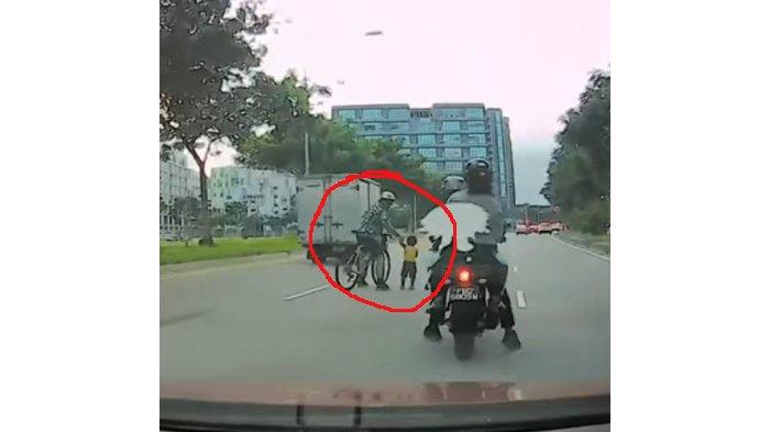Anak kecil itu hampir saja ditabrak oleh truk besar berjenis Lorry, untung saja seorang pengendara sepeda yang dengan cepat menarik anak itu ke sisi jalan.
