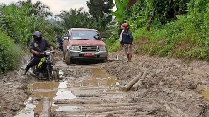 Jalan rusak berupa lumpur yang dalam dan sangat sulit dilalui, terutama saat musim hujan. Warga berinisiatif menyusun batang kayu bulat di atas lumpur, agar bisa dilalui kendaraan. Tapi tetap saja sulit dilalui.