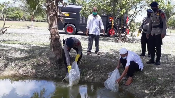 SERAMBINEWS.COM, SUKA MAKMUE - Personel Kompi 3 Batalyon C Pelopor Satbrimobda Aceh bersama Dinas Kelautan dan Perikanan (DKP) Nagan Raya melepas bibit ikan nila sebanyak 15.000 ekor, Rabu (3/6/2020).