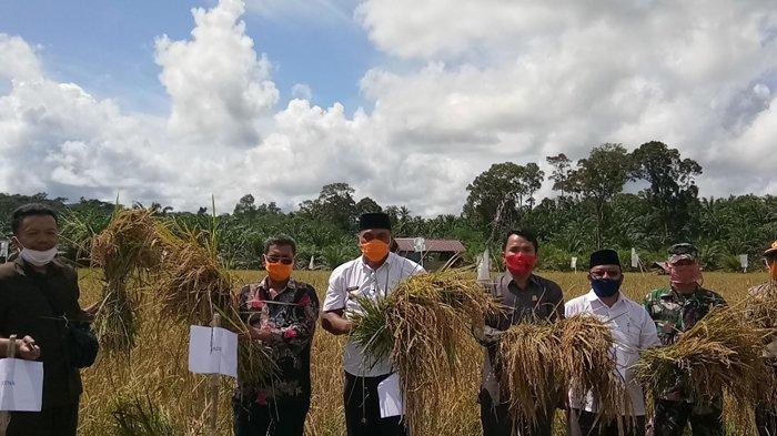 SERAMBINEWS.COM, SINGKIL - Bupati Aceh Singkil, Dulmusrid bersama Ketua DPRK setempat Hasanudin Aritonang dan anggota DPRK Lesdin Tumangger serta Jaimar, melakukan panen raya padi di areal pesawahan di Desa Lae Balno, Danau Paris, Rabu (3/6/2020).