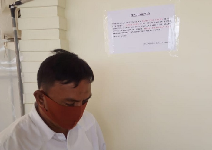 Sehingga pihaknya pun sudah menempel pengumuman di rumah sakit, bahwa pada Kamis besok tidak ada pelayanan rapid test gratis pada masyarakat umum,sampai dengan alat kembali tersedia.
