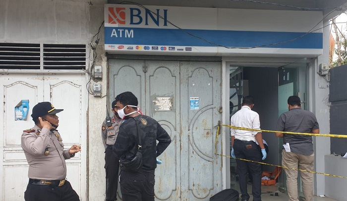 Aparat Polres Lhokseumawe dan Polsek Samudera melalukan penyelidikan di mesin ATM yang berada pinggir jalan Banda Aceh Medan, Desa Mancang Kecamatan Samudera, Aceh Utara, Senin (13/7/2020).