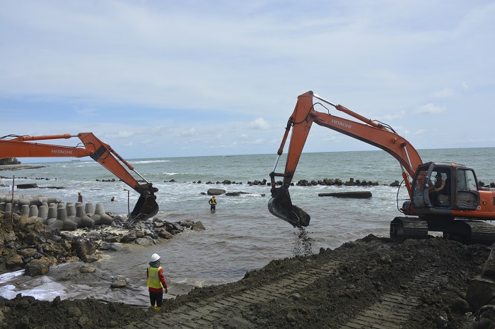 Para petugas terlihat bekerja ekstra, untuk menuntaskan pembangunan tanggul pengaman bibir pantai di daerah tersebut yang direncanakan selesai pada Desember 2020.
