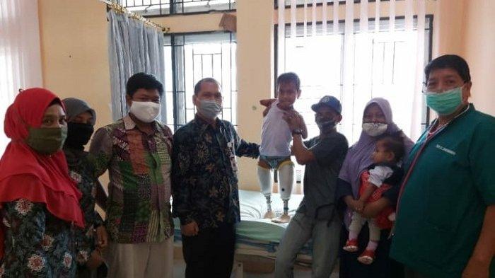Bantuan kaki palsu diserahkan sekaligus dipasangkan oleh Direktur RSUD Sulthan Abdul Aziz Syah Peureulak, dr Dharma Widya, kepada M Alparo didampingi kedua orang tuanya di RSUD setempat, Kamis (23/7/2020).