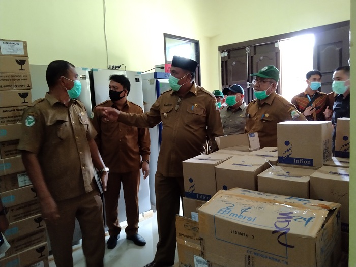 Setelah memberikan pengarahan tertutup, Bupati Dulmusrid mengecek persediaan obat serta persediaan alat pelindung diri (APD) di dinas tersebut.