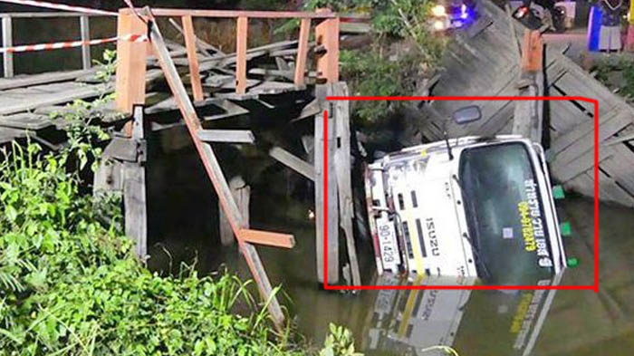 Jembatan kayu itu tidak mampu menahan beban truknya sehingga truknya jatuh ke dalam sungai.