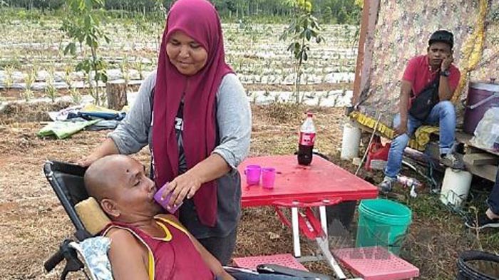 Meski mengalami cedera selama 16 tahun, sang istri Noor Aklima Husin setia menemani suaminya dalam berbagai keadaan.