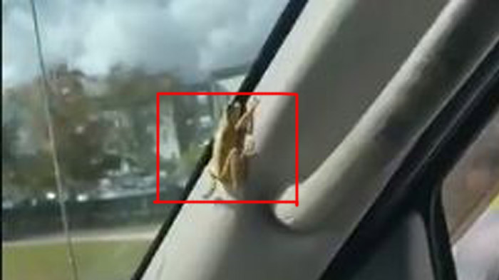 Puncak video itu ketika kodok tiba-tiba kodok melompat yang diduga tepat pada wajah pengemudi.