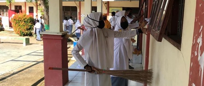Ia menyebutkan pada hari pertama sekolah, siswa membersihkan ruang belajar dan kemudian mengikuti penjelasan terkait penerapan protokol kesehatan.