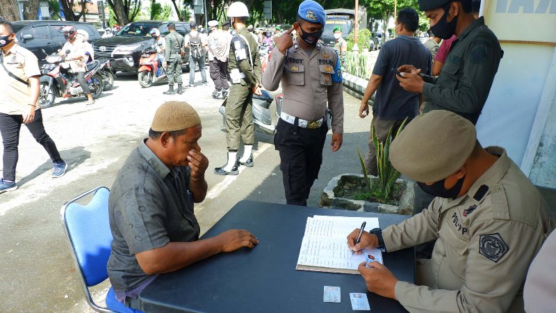 Bagi yang tidak sama sekali membawa masker, petugas akan mencatat dan memberi sanksi sosial. Hukuman itu seperti mencabut rumput yang ada di taman kota atau membaca ayat pendek.