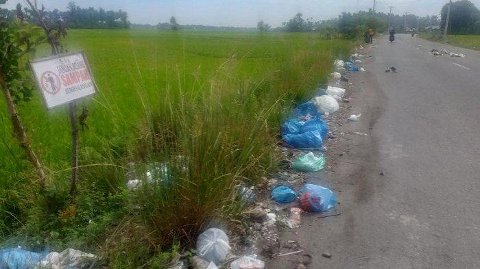 Amatan Serambinews.com, sampah umumnya dalam plastik, karung bekas berserakan di pinggir jalan yang bersisian dengan areal persawahan di kawasan Desa Geulanggang Teungoh, Desa Cot Gapu Bireuen.