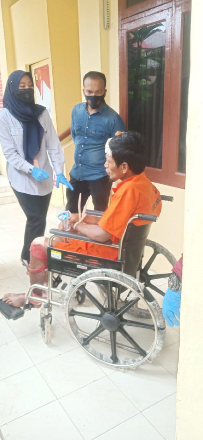 Tersangka Samsul Bahri (41) bukan berumur 36 tahun seperti diberitakan sebelumnya, terlihat memakai baju tahanan warna orange dan kakinya dibalut perban bekas tembakan, duduk di kursi roda dan dijaga ketat aparat.