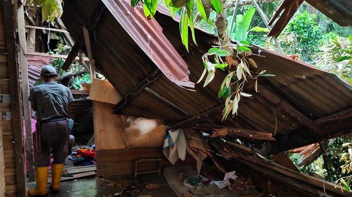 Pohon berukuran besar itu tumbang dan menimpa bagian tengah rumah hingga membuat atap roboh dan bangunan rumah rusak parah.