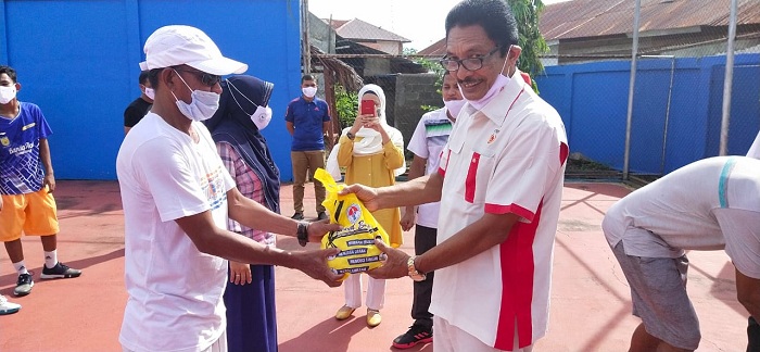 SERAMBINEWS.COM, BANDA ACEH – Ketua Pemusatan Latihan Daerah (Pelatda) atlet Aceh menuju Pekan Olahraga Nasional (PON) XX/2021 di Papua, Drs Bachtiar Hasan MPd menyerahkan alat pelindung diri (APD) bantuan Kementerian Pemuda dan Olahraga (Kemenpora) RI kepada atlet soft tenis Aceh.