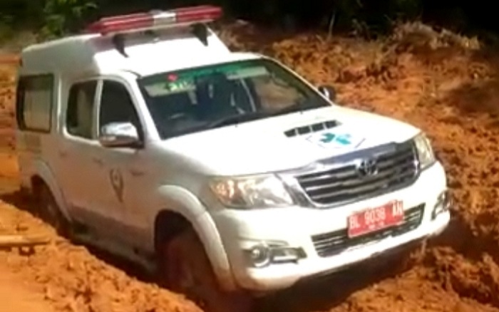 Tapi tak semudah itu, sopir terpaksa mundur lagi ke hilir bukit dan mengulanginya, tapi ambulans tetap sangkut di lumpur hingga akhirnya bisa melewatinya setelah ditarik truk. “Saat ambulans berusaha melewati jalan berlumpur, pasien tetap di dalam mobil dan telah dipasangkan pengaman, tak ada pilihan lain,” cerita Maimunah.