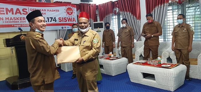 SERAMBINEWS.COM, SIGLI - Pemerintah Aceh menyerahkan 96.914 masker untuk siswa dan guru di Pidie.Masker tersebut diserahkan Kepala Dinas Kebudayaan dan Pariwisata (Disbudpar) Aceh, Jamaluddin SE MSi Ak, yang diterima Bupati Pidie, Roni Ahmad SE atau Abusyik di pendopo bupati setempat, Selasa (1/12/2029).