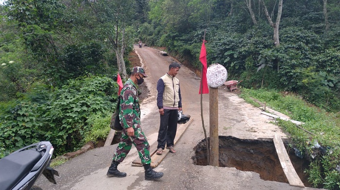 Komandan Koramil 05/Permata Kapten, Inf Jan Suhardi menyampaikan, jalan yang menghubungkan dua desa tersebut amblas akibat air hujan yang begitu deras sehingga membuat sisi kiri dan kanan badan jalan roboh terbawa arus.