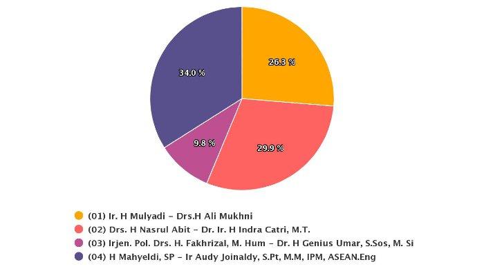 Mahyeldi-Audy Joinaldy yang diusung PKS dan PPP, saat ini mempimpin perolehan suara, dengan mengantongi 342.023 suara atau 34,0 persen suara masuk.