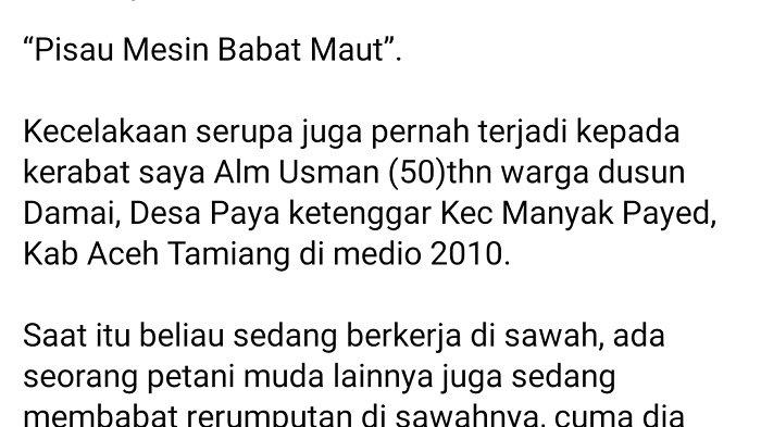 "Kecelakaan serupa (seperti yang dialami Anna) juga pernah terjadi kepada kerabat saya Alm Usman (50) thn warga dusun Damai, Desa Paya ketenggar Kec Manyak Payed, Kab Aceh Tamiang di medio 2010," tulisnya.