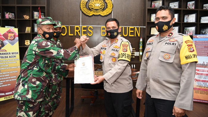 SERAMBINEWS.COM, BIREUEN - Komandan Koramil 05/Juli, Kodim 0111/Bireuen, Kapten Inf Ali Akbar bersama seorang anggota Babinsa setempat Koptu Ari Prastowo, Kamis (14/01/2021) mendapat penghargaan dari Kapolres Bireuen AKBP Taufik Hidayat SH SIK MSi yang didampingi Wakapolres Bireuen, Kompol Adli SE.