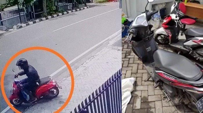 Pelaku kemudian berjalan-jalan di depan kantor Si Cepat sebelum akhirnya menggondol sepeda motor Honda Scoopy merah berplat nomor AD-4862-AJQ.