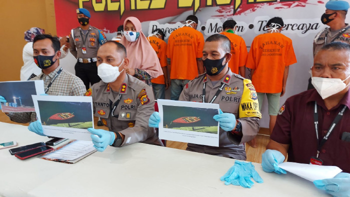 Kelima tersangka yang diringkus adalah Rg (36), MD (26), DI (36) selaku otak pelaku yang mencuri minyak dari kapal tanker. Sedangkan dua tersangka lain yakni MS (37) dan FR (40) bertugas menunggu di tepi pantai untuk lansir minyak hasil curian tersebut. "Dua pelaku yang menunggu di pinggir pantai melarikan diri setelah mendengar suara tembakan, tapi sekarang juga sudah kita tangkap," ungkap Kapolres.