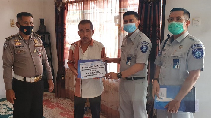 Kedatangan petugas Jasa Raharja ini untuk membantu persyaratan administrasi, sekaligus menyerahkan santunan Jasa Raharja tersebut senilai Rp 50 juta.