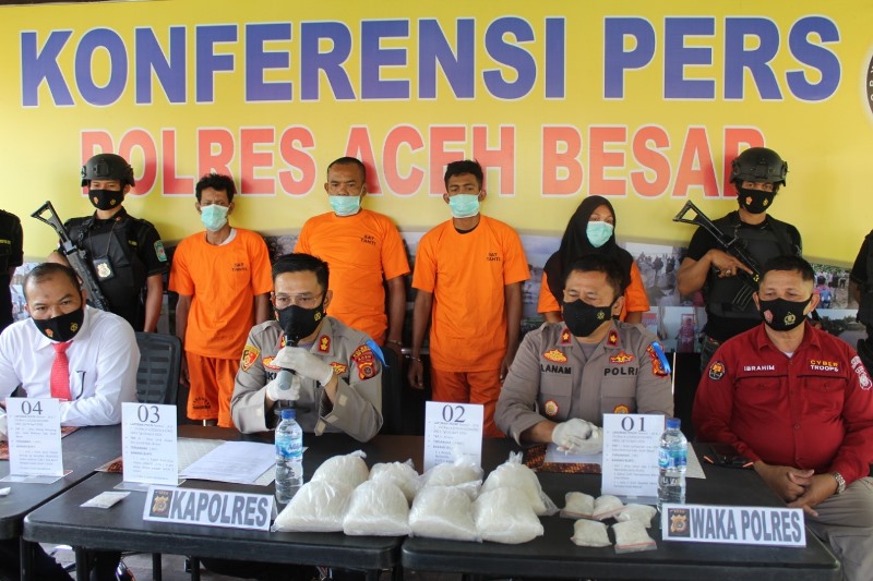 Selain menghadirkan keempat tersangka, dalam konferensi pers itu juga diperlihatkan barang bukti sabu dan senjata api rakitan. "Mereka adalah sindikat narkoba jaringan internasional. Barang haram ini berasal dari Bireuen yang pernah tertangkap ratusan kilogram beberapa lalu," ujar Kapolres Aceh Besar.