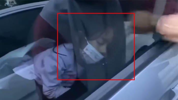 Si ibu terlihat seperti panik mengetuk-ngetuk keras kaca mobil.