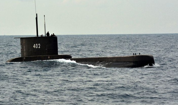 Kapal selam KRI Nanggala-402 buatan tahun 1952 saat latihan Pratugas Satgas Operasi Pengamanan Perbatasan (Pamtas) Maphilindo 2017 di Laut Jawa, Jumat (20/1/2017).