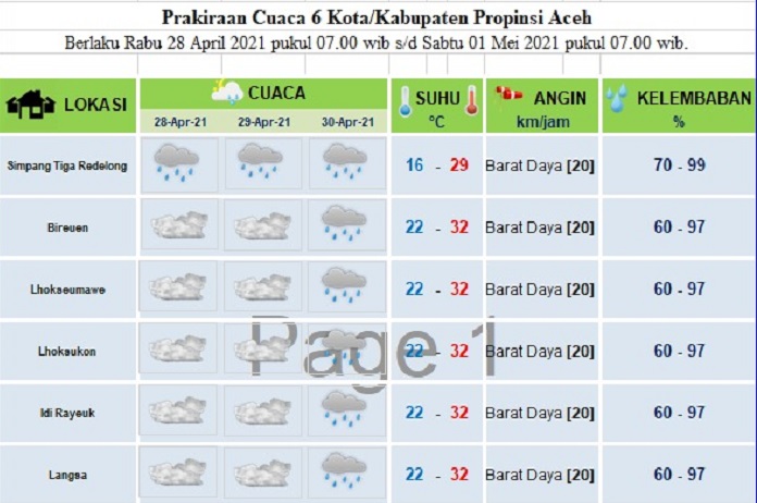 Menurut prakiraan BMKG, enam kabupaten/kota di Aceh akan terjadi hujan ringan dan berawan selama tiga hari ke depan, yakni mulai Rabu (28/4/2021) besok atau hari ke-16 Ramadhan hingga Jumat (30/4/2021) nanti yang merupakan hari ke-18 Ramadhan.
