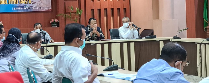 Rakor Dalam Rangka Ketersediaan Stok Pangan dan Stabilitas Harga Bahan Pangan Pokok Menjelang Hari Raya Idul Fitri 1442 Hijriah ini di Gedung Serbaguna Kantor Gubernur Aceh, Banda Aceh, Jumat (30/4/2021).