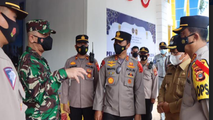 SERAMBINEWS.COM, BANDA ACEH - Kepala Kepolisian Daerah atau Kapolda Aceh, Irjen Pol Drs Wahyu Widada, MPhil dan Pangdam IM, Mayjen TNI Achmad Marzuki meninjau langsung kesiapan dan situasi di Pos Pam Operasi Ketupat Seulawah di Pelabuhan Ulee Lheue dan Terminal Batoh, Kota Banda Aceh, Senin (10/5/2021).