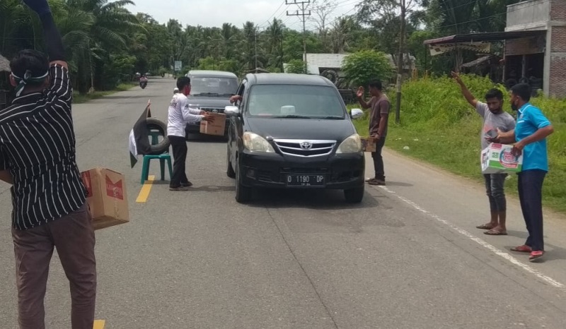 Sebagian para pemuda juga menggalang dana dari pelintas di jalan raya dekat pusat Kota Peulimbang.