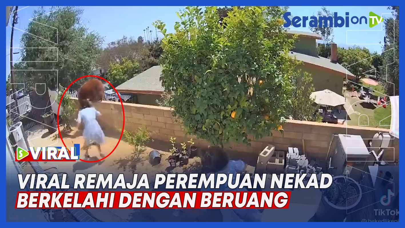 SERAMBINEWS.COM - Viral seorang remaja perempuan di California berkelahi dengan beruang yang berusaha menyerang anjingnya tertangkap kamera CCTV.