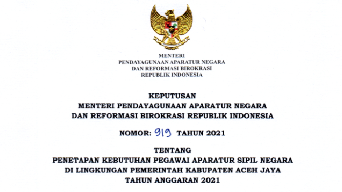 tentang Penetapan Kebutuhan Pegawai Aparatur Sipil Negara di Lingkungan Pemerintah Kabupaten Aceh Jaya Tahun Anggaran 2021.