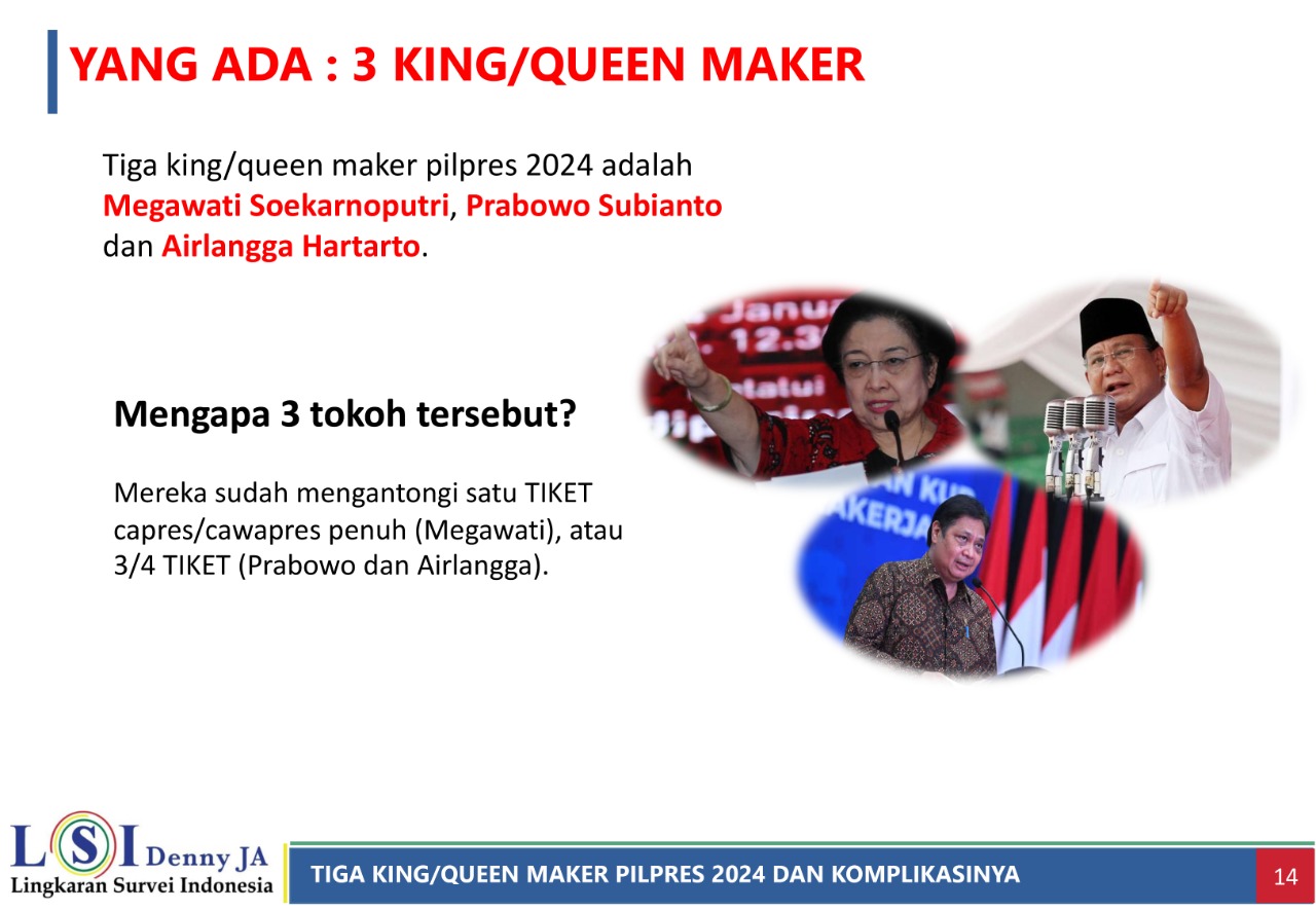 SERAMBINEWS.COM, JAKARTA - Peneliti Lingkar Survei Indonesia (LSI), Denny JA, Adjie Alfaraby, mengungkapkan bahwa Ketua Umum PDIP Megawati Soekarnoputri, Ketua Umum Partai Golkar Airlangga Hartarto, dan Ketua Umum Partai Gerindra Prabowo Subianto merupakan king maker Pemilihan Presiden (Pilpres) 2024.