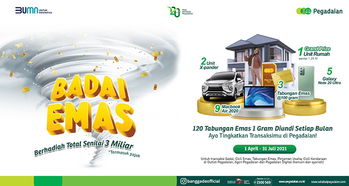 Sementara untuk hadiah Grand Prize yang disediakan oleh Pegadaian untuk para nasabahnya yakni 9 Macbook Air, 5 Samsung Note 21 Ultra, Tabungan Emas 300 gr, Mobil Expander, hingga rumah senilai Rp 1,25 Miliar.