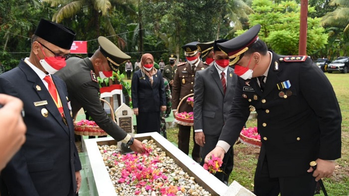 SERAMBINEWS.COM, BIREUEN – Ditengah cuaca mendung dan rintik-rintik hujan gerimis unsur Forkopimda Bireuen, Senin (16/08/2021) pagi menziarahi dan melakukan peletakan karangan bunga, tabur bunga di makam pahlawan Kolonel Husein Yusuf di Gampong Geulumpang Payong, Jeumpa Bireuen sebagai ziarah nasional memperingati HUT RI ke 76.
