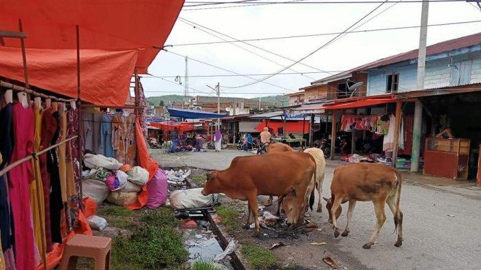 Pedagang dan Pembeli Keluhkan Sapi Berkeliaran di Pusat Pasar Kutapanjang