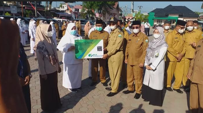Penyerahan kartu BPJS Ketenagakerjaan sebagai tanda mereka sudah terdaftar dilakukan secara simbolis, Senin (4/10/2021) oleh Bupati Bireuen, Dr H Muzakkar A Gani SH MSi, didampingi Direktur RSUD dr Fauziah Bireuen, dr Amir Addani M Kes dan juga Kepala BPJS Ketenagakerjaan, Mislina dan sejumlah pejabat lainnya pada apel pagi