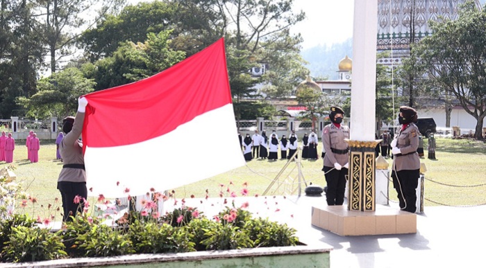 Untuk petugas pengibar bendera merah putih, terdiri dari Briptu Rizki Ayu Dhila, Briptu Anggun Tri Suci Cahaya, dan Briptu Purnama Sari.