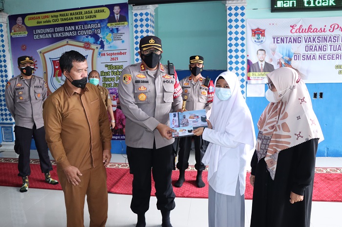 SERAMBINEWS.COM, LANGSA - Kapolres Langsa, AKBP Agung Kanigoro Nusantoro, SH, SIK, MH, Senin (3/1/2022) menyerahkan 1 tiket gratis umrah merupakan undian doorprize vaksinasi kepada seorang siswa SMAN 1 Langsa.