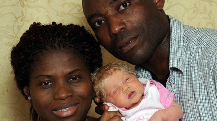 Meskipun pasangan ini kedua berkulit hitam, sang istri malah melahirkan anak berkulit putih dan berambut pirang.