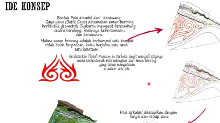 Ide konsep Open Site Museum Loyang Mendale bersumber dari motif “emun beriring Kerawang Gayo.”