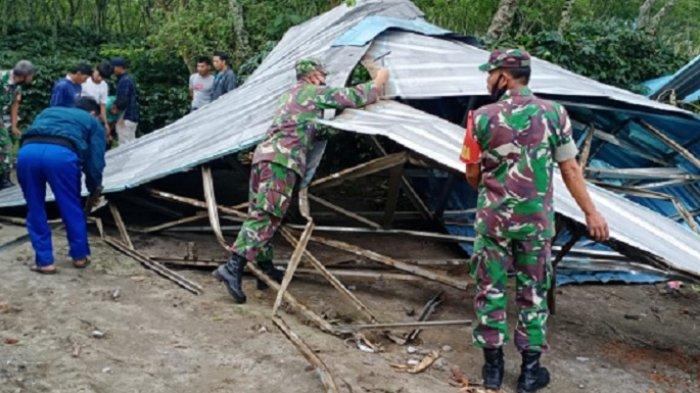 Rumah warga yang rusak diterjang puting beliung di Bener Meriah mulai dibersihkan. Personel TNI dari Koramil 06/Bukit bersama warga membersihkan