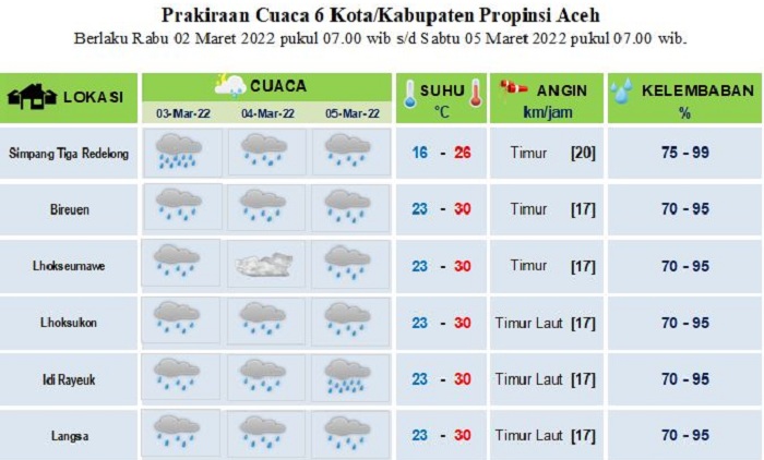 Prakiraan cuaca tersebut berlaku untuk enam kabupaten/kota di Aceh selama tiga hari kedepan, yakni sejak Senin (7/3/2022) sampai Rabu (9/3/2022).