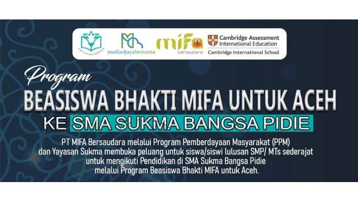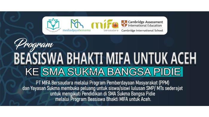 SERAMBINEWS.COM, MEULABOH - Melalui program Beasiswa Bhakti Mifa Untuk Aceh, PT Mifa Bersaudara bekerjasama dengan Yayasan Sukma kembali membuka peluang untuk siswa/i lulusan SMP/MTs sederajat untuk mengikuti pendidikan di SMA Sukma Bangsa Pidie secara gratis hingga tamat sekolah.