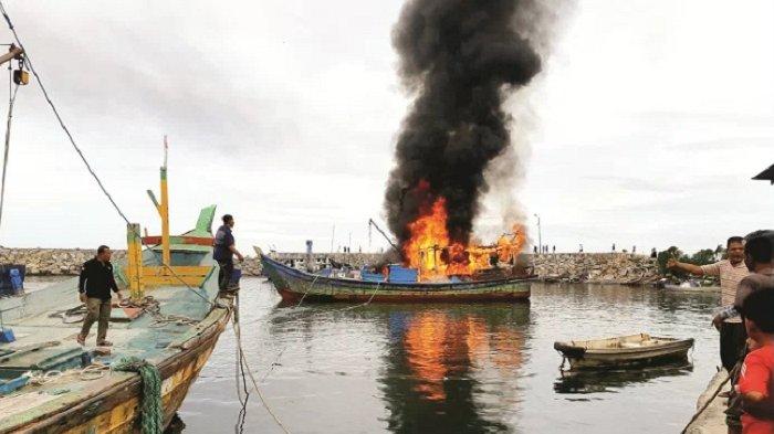 Kapal Motor (KM) Ariya Purnama terbakar di kolam Pelabuhan Pendaratan Ikan (PPI) Sawang Ba'u, Kecamatan Sawang, Aceh Selatan
